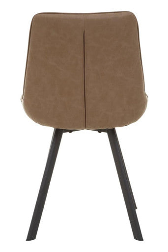 This dining table's rectangular natural wood finish top with curved seats in brown leather effect upholstery. The set is complemented with the black finish trestle base that enhances modern minimalism.
