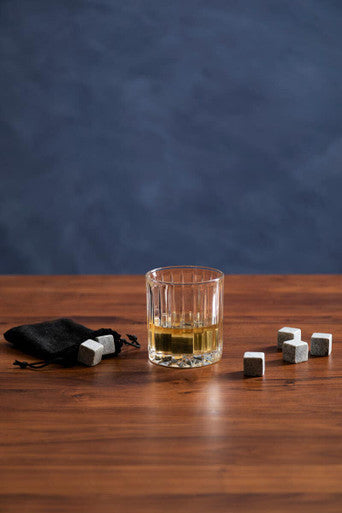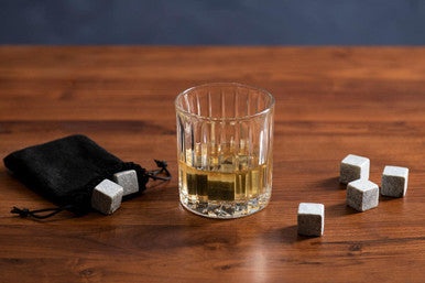 Designed to quickly chill without dilution, this set of grey granite cubes will keep the taste of liquor intact. Non-porous and lightweight, these stones can be stacked into the velvet pouch with a drawstring.