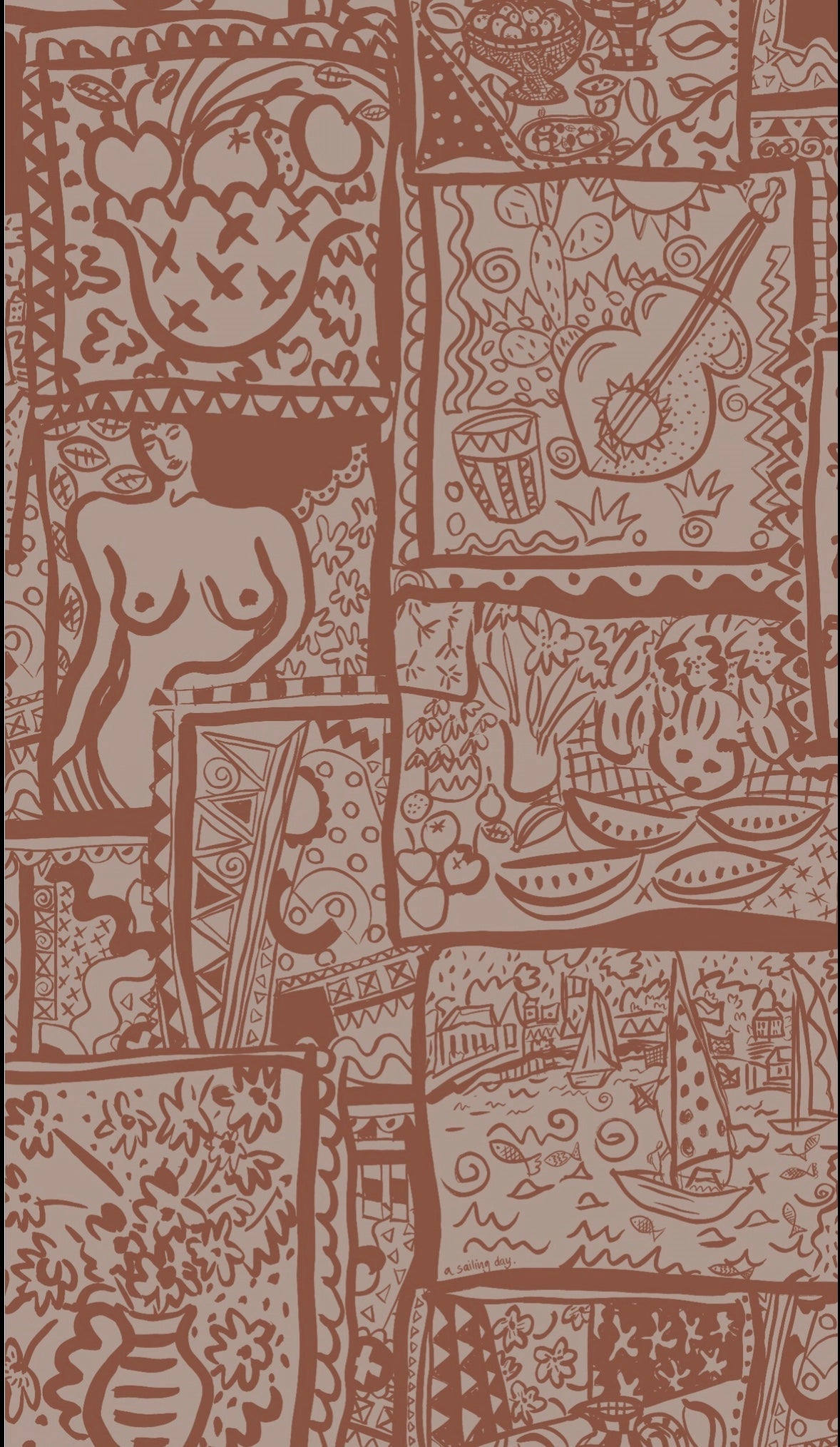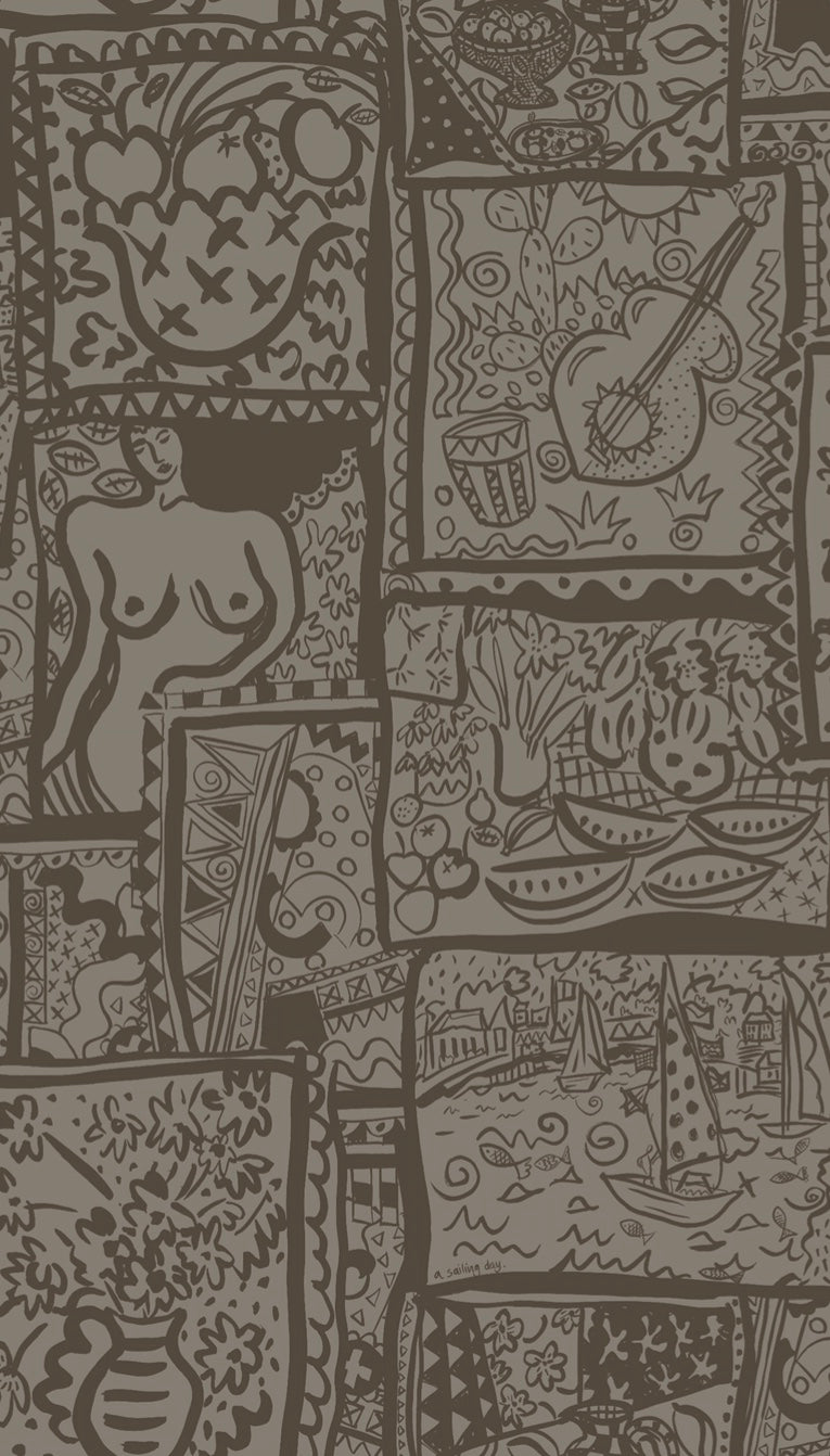 WISH YOU WERE HERE WALLPAPER, A design inspired by holiday snaps and memories of good times on vacation. Postcards, of sailing boats, silhouettes of lounging sunbathing figures and holiday excursions. Designed in our studio, the wallpaper is based on a series of screen prints from our new collection.