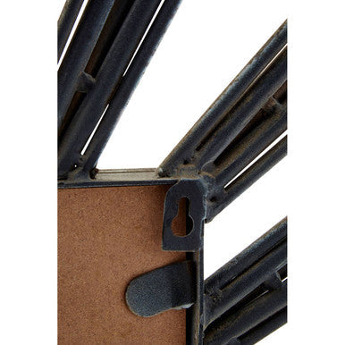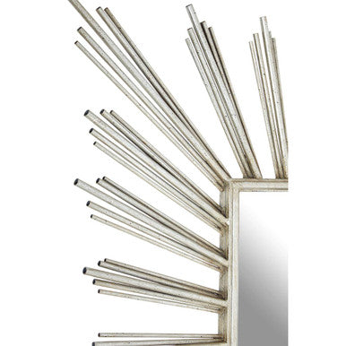 The mirror's rectangular frame is made from metal and has an antique silver colour. It features bevelled corners and ridged sides, while the small black speckles that cover its surface contribute to its distressed look.